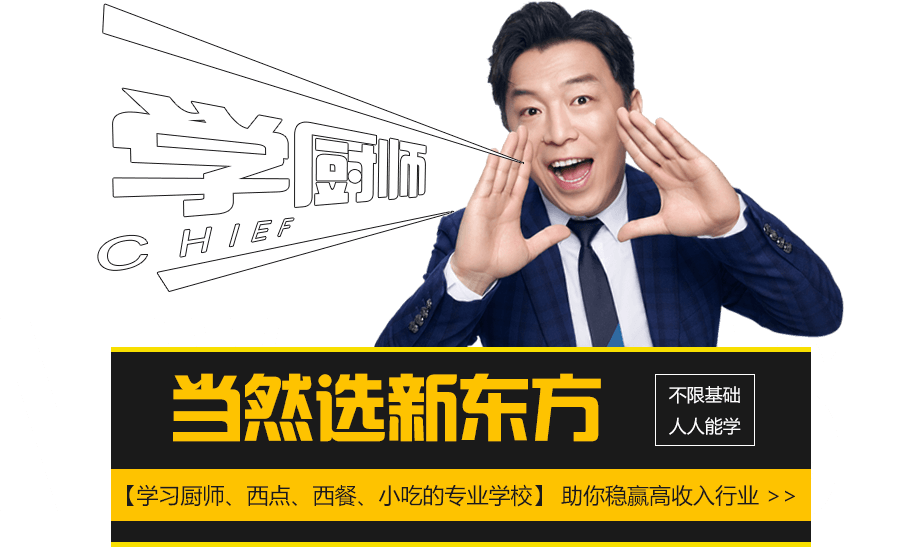 新东方烹饪教育,在对餐饮市场进行充分调研的基础上,根据餐饮行业对烹饪人才的需求, 对中国各种经典菜系及地方特色菜系进行深入研发,开设了“以大专教育为龙头,以高技、 中技为主体,以长短期培训为补充”的中烹、西点、西餐、小吃等多种专业,保证学员轻松就业和创业。
