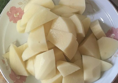 5.把土豆清洗干净去皮,切成和排骨相当的丁备用。