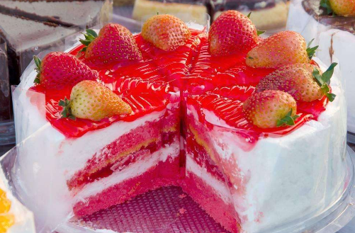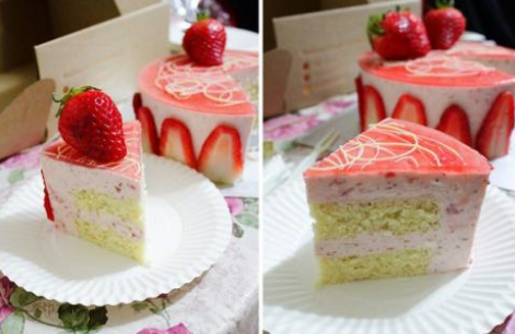 B: 冻芝士材料:戚风蛋糕片、塔图拉奶油芝士150g、草莓酱150g、紫风车淡奶油150g、牛奶30g、吉利丁片1片半(5g每片)、白砂糖40g。