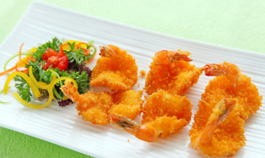 5. 锅中油烧至7成热,放入虾肉,炸至金黄色,捞出沥干油,即可装盘。