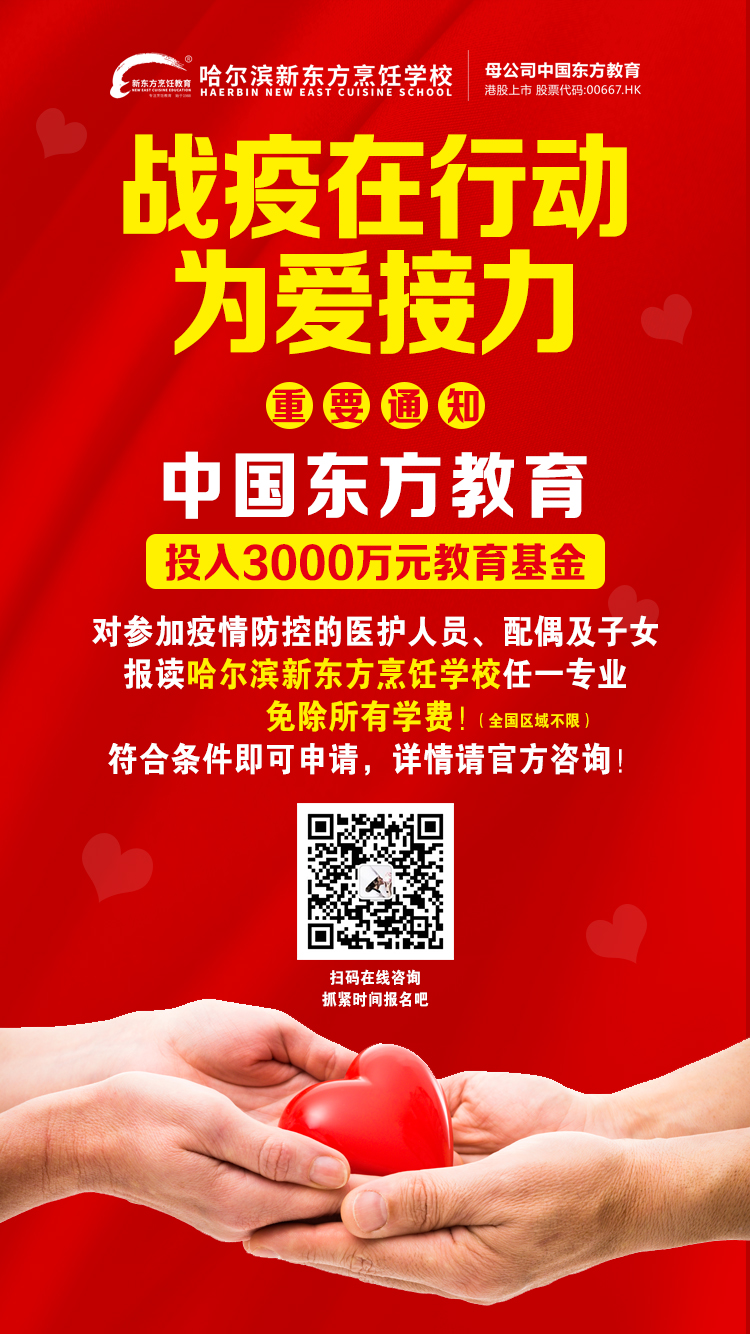 哈尔滨新东方烹饪学校积极响应,执行母公司中国东方教育3000万“抗疫”教育基金,致敬最美逆行者,凡参加2020年抗击新型冠状病毒疫情的一线医护人员及配偶、子女,报读哈尔滨新东方烹饪学校,我们可为您申请享受学费全免政策,这一次,换我们来守护你们的梦想!