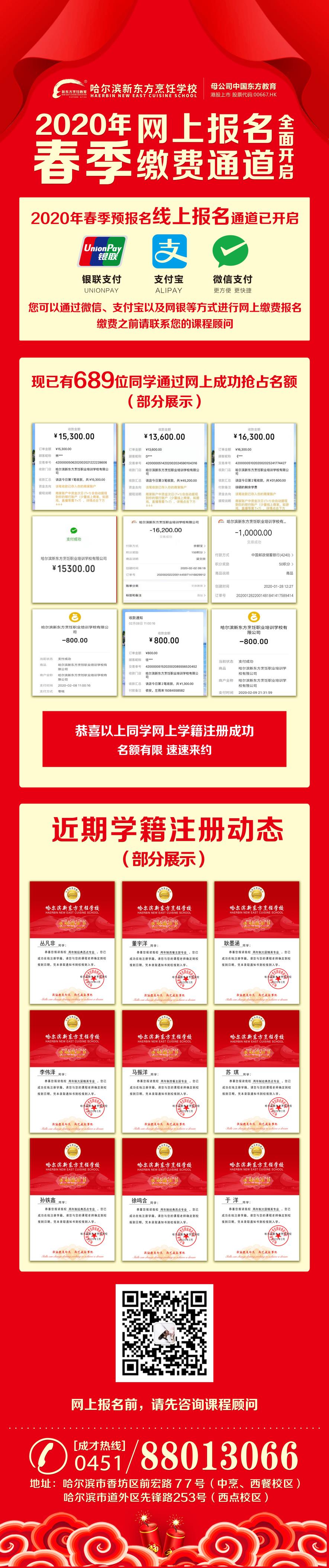 A :我校开通了两种报名通道方便同学们在家通过观看视频、微信1对1线上参观(点击下方“在线咨询”即可预约一对一在线参观)、网站搜索(哈尔滨新东方烹饪学校)等多种方式了解学校,也可以识别下方二维码填写下方表单我们将尽快给您回电。