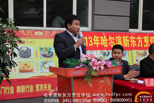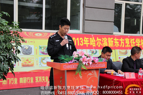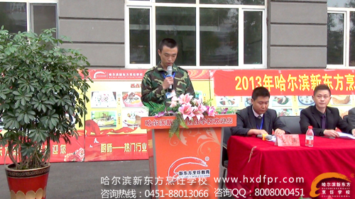 哈尔滨新东方烹饪学校2013级新生代表也上台发言,就学生参加军事训练的意义和作用发表了自己的看法,并表示了“流血流汗不流泪、掉皮掉肉不掉队”的训练决心,为军训结束后学习、生活打下坚实的基础。