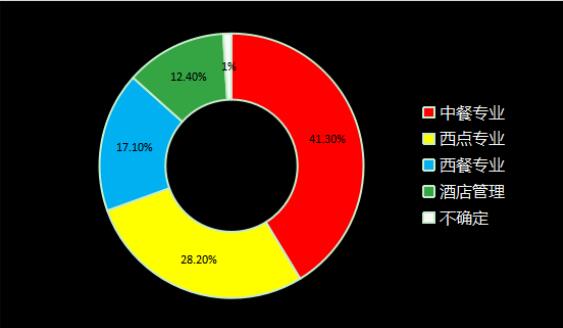 如图所示,41.3%的人选择了中餐专业,28.2%的人选择了西点专业,17.1%的人选择了西餐专业,12.4%的人选择了酒店餐饮管理专业,还有1%的人不确定自己会选择哪一个专业方向。
