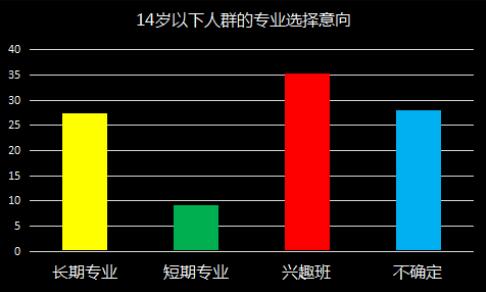不同年龄阶段的人群在选择专业上有什么不同?如图所示,14岁以下的人群更中意兴趣培养,更愿意选择兴趣班,但同时他们的不确定因素较多,容易受他人影响而更改选择。