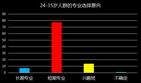 如图所示,24-35岁的人群以白领阶层、有志青年和全职太太为主,白领阶层和全职太太追求生活品质,更可能选择兴趣班,提升厨艺,扩展技能;而有志青年大都已经经历过社会的磨炼,与坚守一份相对稳定但薪资一般的工作相比,更想寻求创业或者投资利润较高的副业,因此更可能选择短期专业,以求快速掌握核心技术,方便创业开店。
