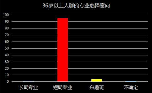 如图所示,36岁以上的人群以中年人士为主,他们大多已经成家且生儿育女,肩负家庭的重担,内心更为坚定,想快速致富,给家庭创造更好的生活条件和物质基础。所以,他们绝大多数都会选择短期专业,而且会对热门小吃和外卖课程更为关注。