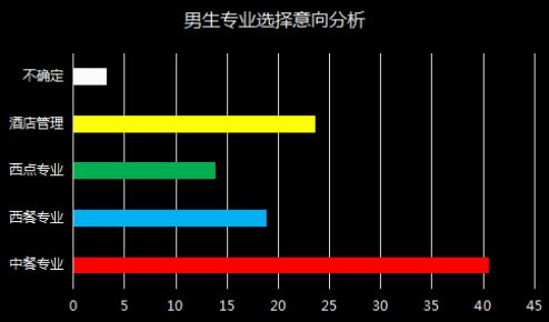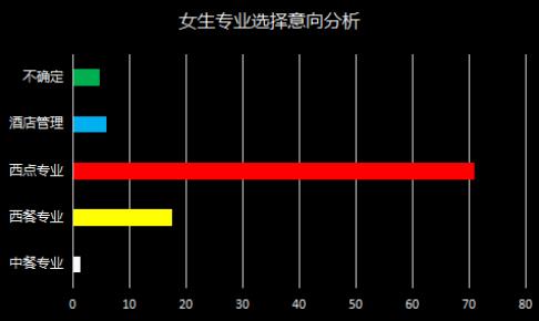 性别不同在选择专业上有什么不同?如图所示,女生绝大多数都选择了西点专业,其次是西餐专业,这与女性的性格有关。相对来说,女生大都心思细腻、有耐心、比较喜欢华丽的装饰和干净的环境,这些性格特质与西点行业不谋而合。西餐相对中餐来说,环境更为清新、不油腻,因此也颇得女生青睐。
