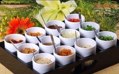 2、调蘸料:视个人口味加入麻酱、蒜、韭菜花、腐乳、糖(也可适当加入陈醋)、辣椒;