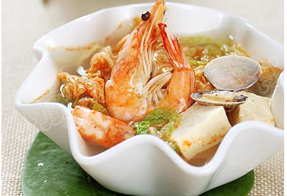 主料:白菜叶100g,豆腐200g,大虾10只,花蛤200g。