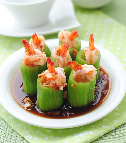 4.将做好的虾球塞在挖好的丝瓜盅里。