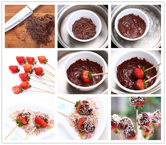 原料:草莓 硬黑巧克力 彩色巧克力针