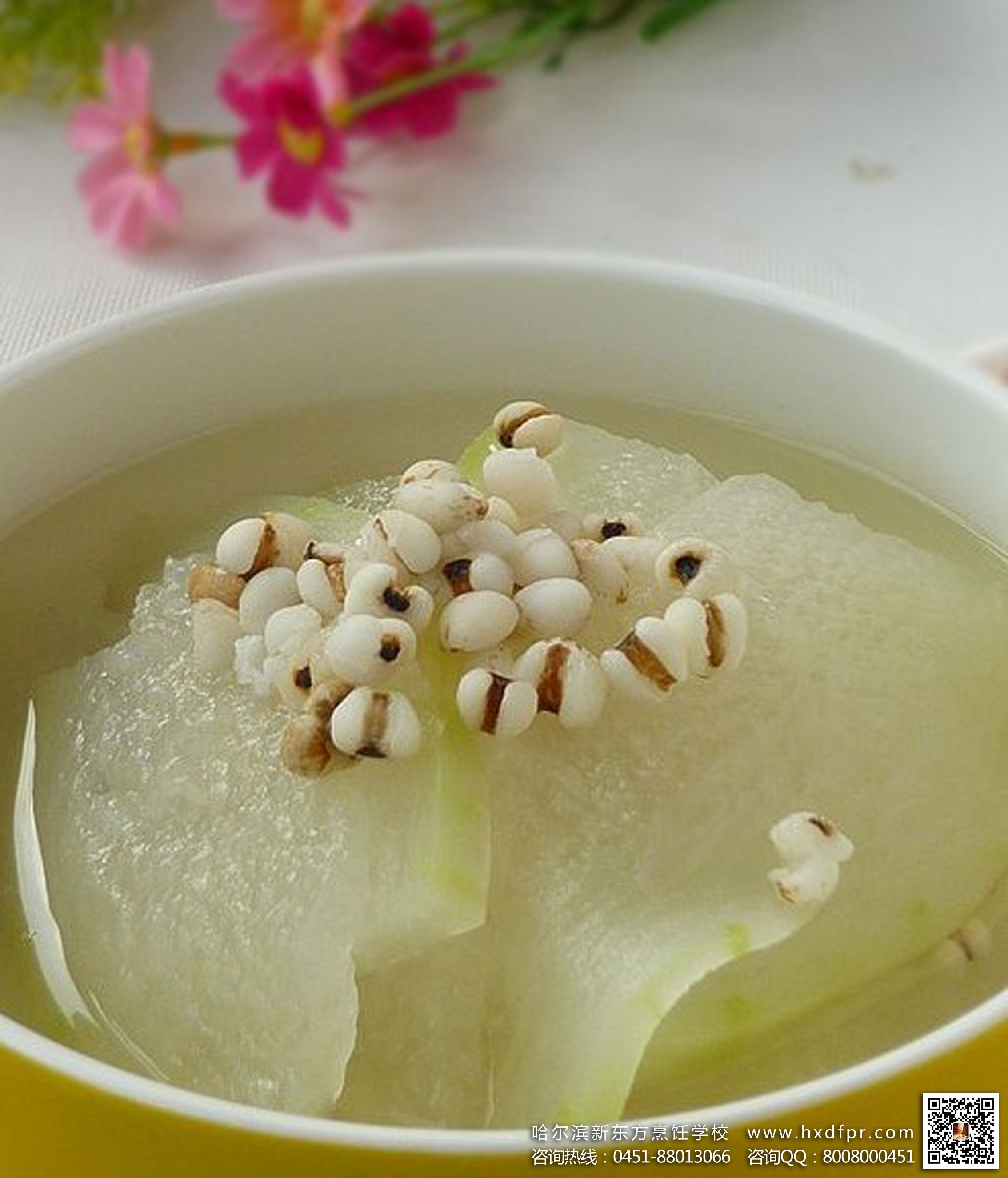 冬瓜清热化痰.除烦止渴。有利水消痰、清热解毒的功效。湿热体质者若有水肿、胀满、痰多、暑热烦闷、消渴、湿疹、疖肿等均可食用,并可解酒。薏米的营养价值很高,被誉为“世界禾本科植物之王”。薏米可用作粮食吃,味道和大米相似,且易消化吸收,煮粥、作汤均可。夏秋季和冬瓜煮汤,既可佐餐食用,又能清暑利湿。由于薏米营养丰富,对于久病体虚、病后恢复期患者,老人、产妇、儿童都是比较好的药用食物,可经常服用。不论用于滋补还是用于治病,作用都较为缓和,微寒而不伤胃,益脾而不滋腻。 原料:冬瓜500克,薏米半小碗