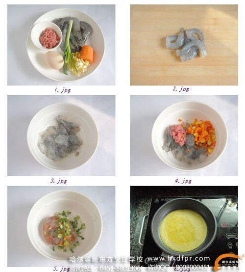 原料:鲜虾8只、鸡蛋1个、肉糜适量、玉米适量、胡萝卜1块