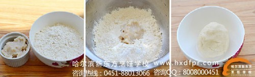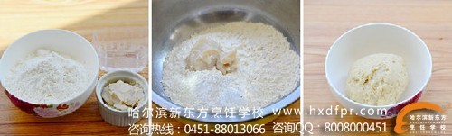 2:猪油加入面粉里,揉均匀,然后水再一点一点加入面粉里,