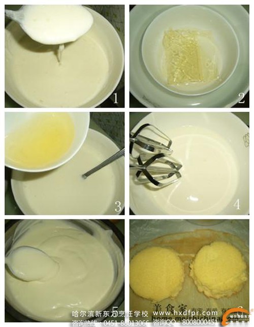 材料:戚风蛋糕2片,酸奶300克,淡奶油200克,吉利丁片1片,水35克