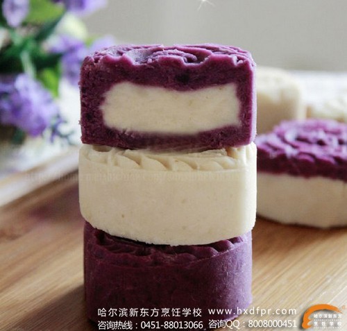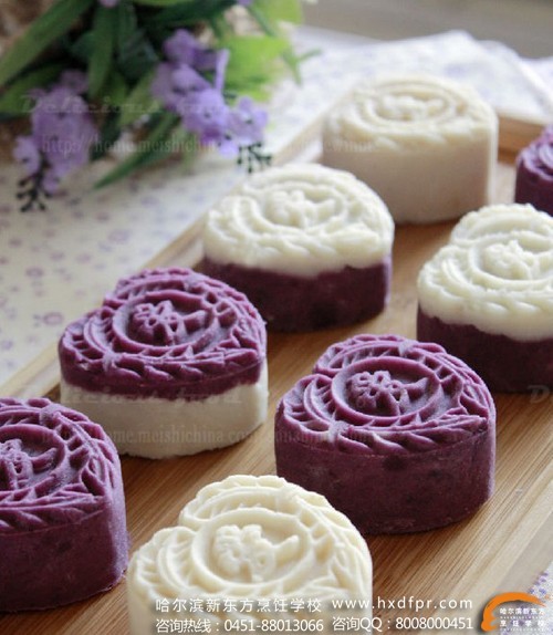 如果是做纯山药的,也是一样,山药压成皮,再包入芸豆馅,如果是做混合月饼,比如说如果用紫薯做顶部的颜色,就先用10克紫薯压在模里,稍微压平些,再用20克山药皮包20克芸豆馅,再放入模里,一压即可。