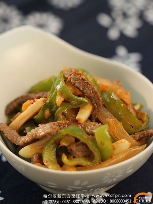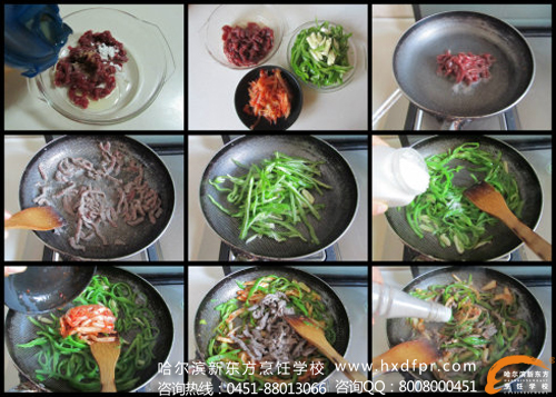 1.将牛肉切成细丝, 加入盐、淀粉、蛋清和油, 再加入点水, 用手抓匀放置十分钟备用;