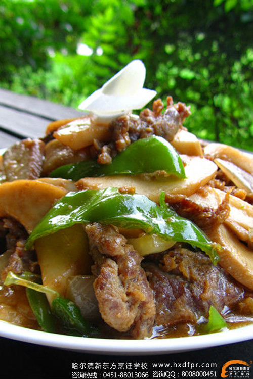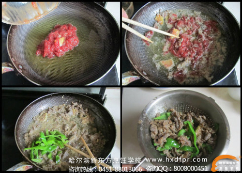 7. 将牛肉滑成六,七成熟时加入青椒;