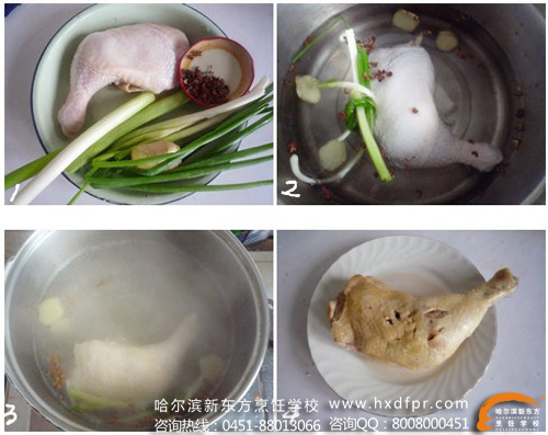 13-14、拆下鸡肉,用擀面杖轻敲鸡肉使鸡肉松软。然后用手撕成细丝,码放在葱丝上。
