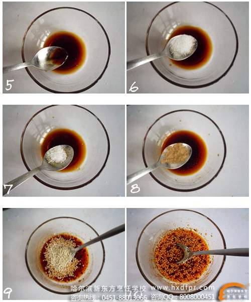 9-10、再加入熟芝麻仁,最后加入香油调匀即可。