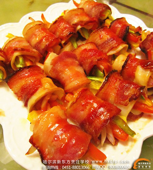 培根4条 大个杏鲍菇2个 青、红、黄椒及洋葱各半个