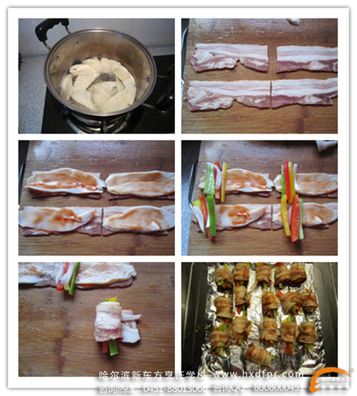 青、红、黄椒及洋葱分别切成5mm左右的条,长度比培根宽2cm的样子,使之卷好后两头各露出1cm左右。主要是为了好看,不露也可以了。