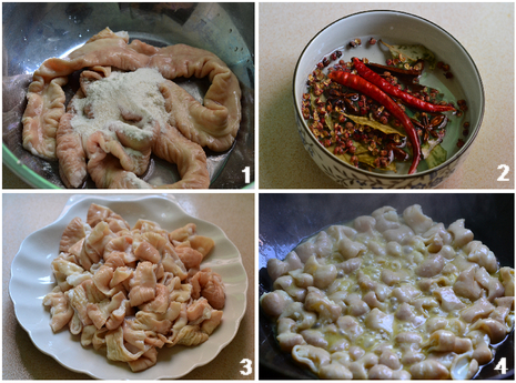 1.洗肥肠的里面时,可将其一头套在拇指上,一边顶,另一只手一边往外拉。