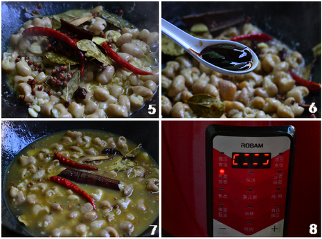 8.将锅内所有食材移至高压锅内,按肉类排骨键,到时将肥肠段单独捞出。
