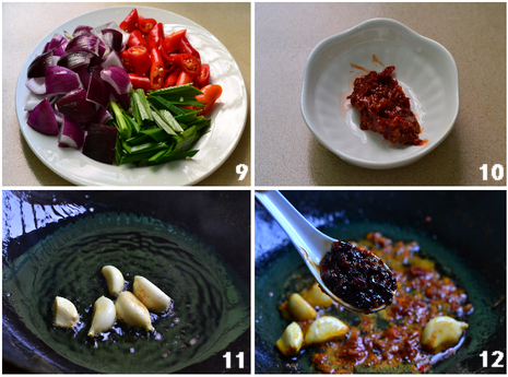 9.洋葱切成块,红椒洗净切块,青蒜苗洗净切成长段。