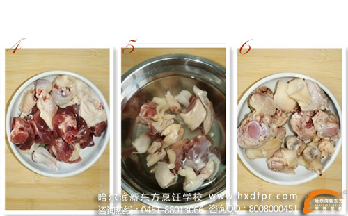 2、锅中加水,水中加许盐,将鸭腿块凉水下锅焯烫,去除鸭腿里的血水和腥味;