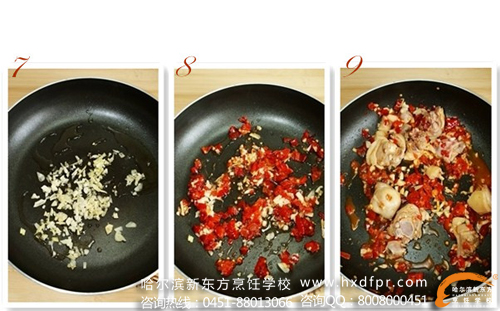 4、锅中加底油,将蒜末、姜末入锅爆香;