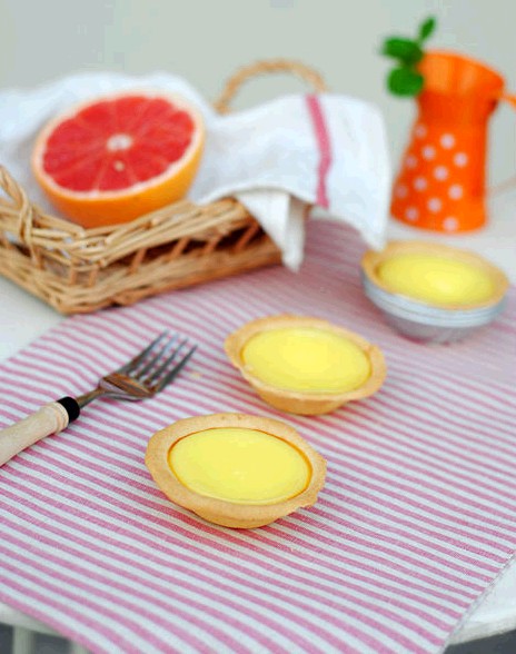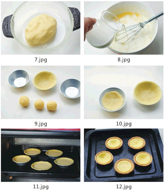 11、将蛋羹液倒在塔皮内,放在烤箱中层,220度烘烤约15分钟。