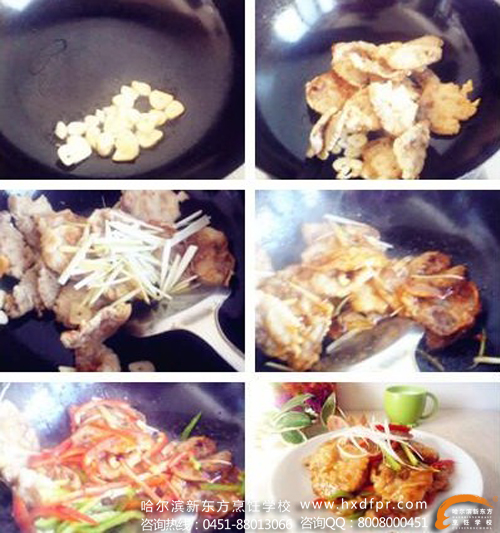 7、爆香蒜片,加入炸好的肉片炒均,放入葱姜丝翻炒均匀。