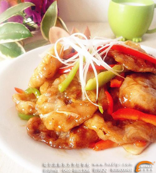 8、倒入调好的碗汁,青红椒丝快速翻炒,待每片肉都均匀沾满料汁即可出锅装盘。