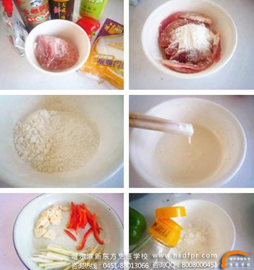 1、猪肉切厚片,用盐,鸡精,胡椒粉、料酒拌匀腌制一下。