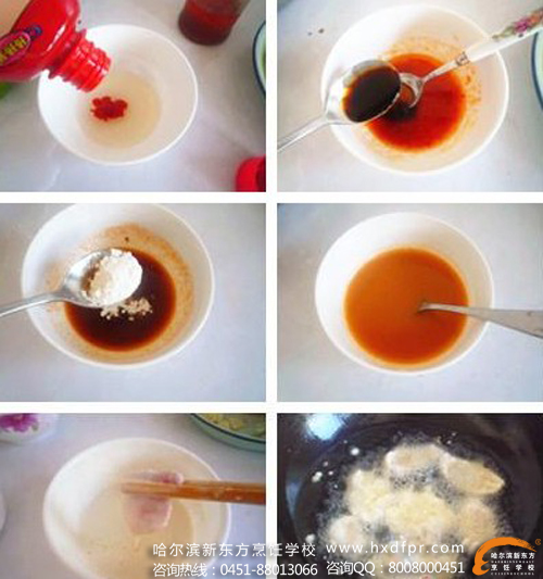 4、白糖3勺、白醋2勺、番茄酱2勺、生抽1勺、淀粉适量加入少许清水,调成一碗碗汁。