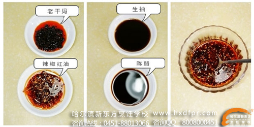 2、老干妈:红油:生抽=1:1:1的比例调制、陈醋依据个人口味酌量添加,再搅拌均匀即可。