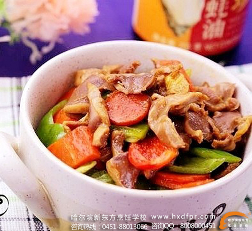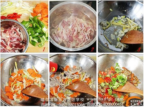 2、烧油爆香姜片、蒜片和葱花,依次放入胡萝卜片、鸡珍、青红椒片,翻炒几分钟,浇入两汤勺蚝油,滴几滴香油,翻炒均匀即可。