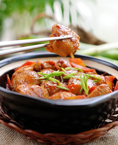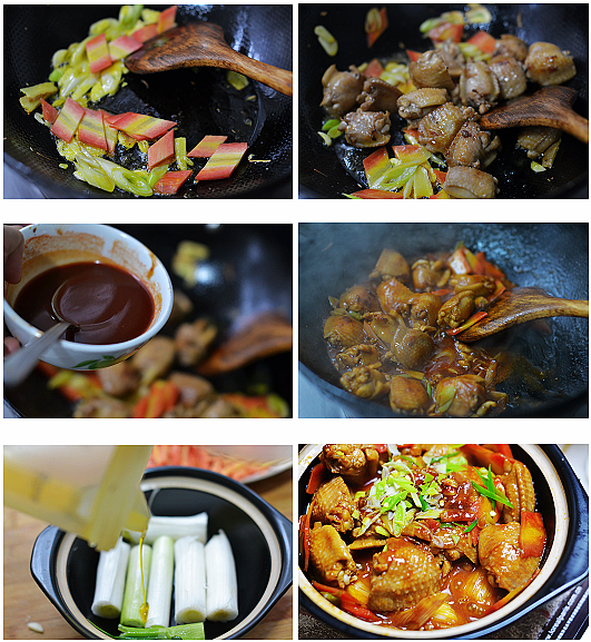 18、把刚才的鸡翅倒入砂锅中,再次放到火上盖上盖子中火烧煮5分钟,待紧油亮汁(也就是汤汁粘稠油亮喷香)撒上少许蒜苗即可出锅(葱花、蒜末都可以)