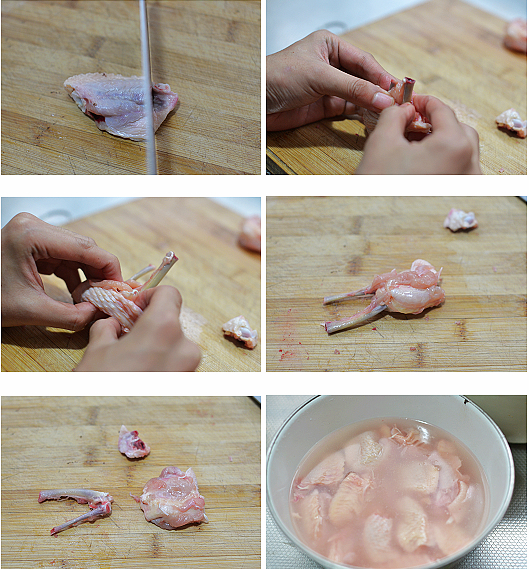 1、鸡翅先来去骨,鸡翅小的一头来一道斩断