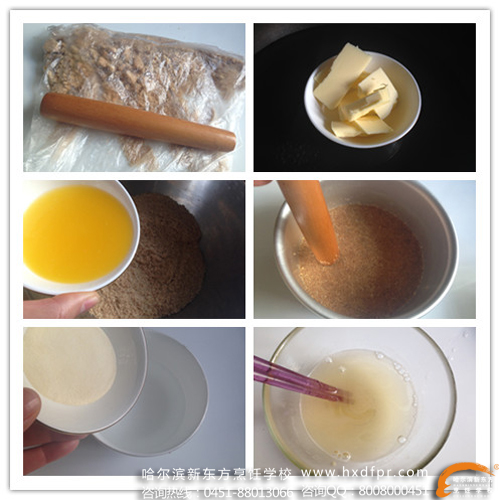 1、将消化饼干装入保鲜袋内,用擀面杖压成碎末