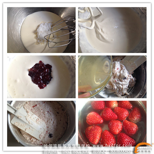 草莓慕斯材料:丘比草莓果酱50g、淡奶油100g、绵砂糖25g、吉利丁粉10g、水40g