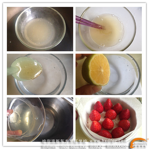 一、将吉利丁粉用冷水泡好,吉利丁粉与水的比例是1:4,再隔水加热至透明状即可,同吉利丁片的效果是一样的