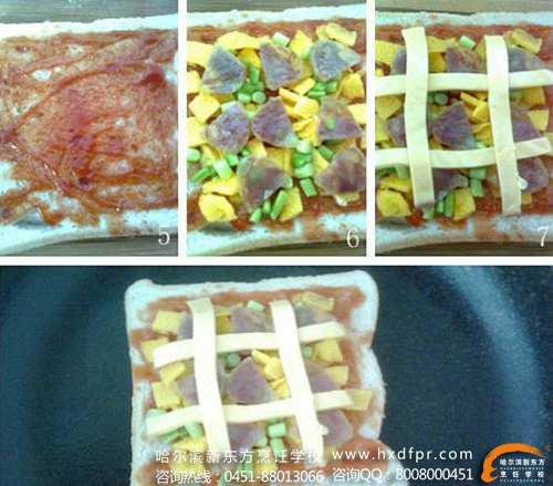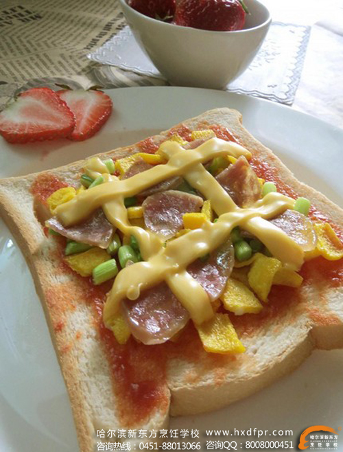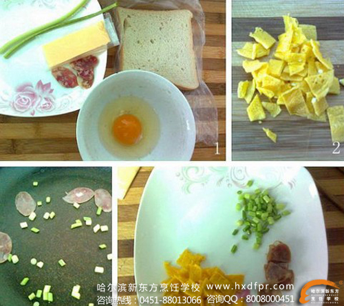 吐司、奶酪、香肠、蒜苗、鸡蛋、番茄酱