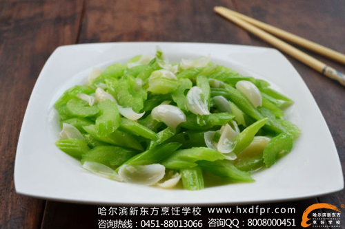 2)西芹洗净,去筋,用斜刀切成片,百合洗净,掰成片,葱蒜切粒