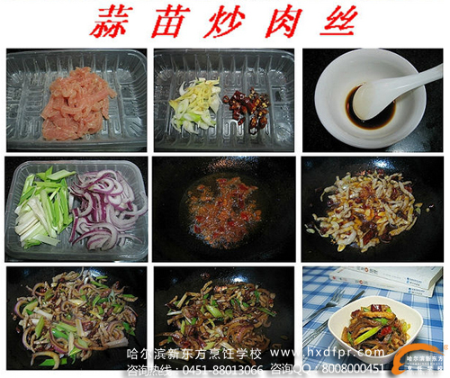 6、入肉丝划散至变白,调入葱姜蒜炒出香味。