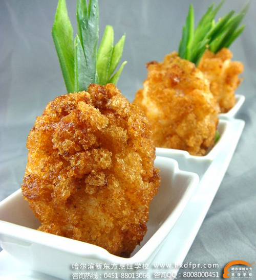 10.用黄瓜皮切成菠萝叶子插在虾球上,一款形似菠萝的美食,皮脆肉爽,香口美味,色泽金黄,作为宴客菜很不错。