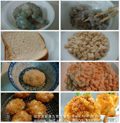 8.然后将粘上蛋清的虾球放入面包粒里均匀裹上面包粒。