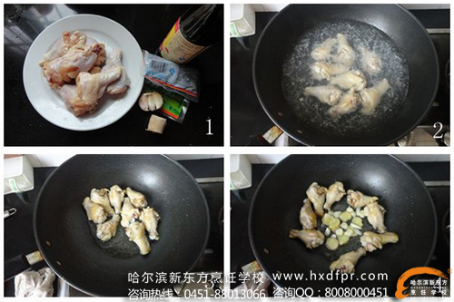 4、再把翅根放边上,下入姜片和蒜瓣煸香。